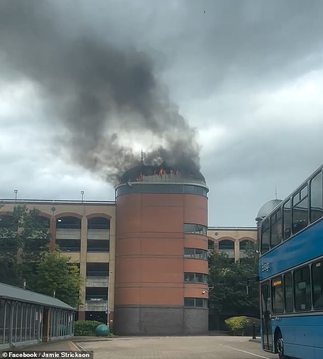 Footage shared on social media shows a large cloud of black smoke billowing into the sky from the roof of a car park.