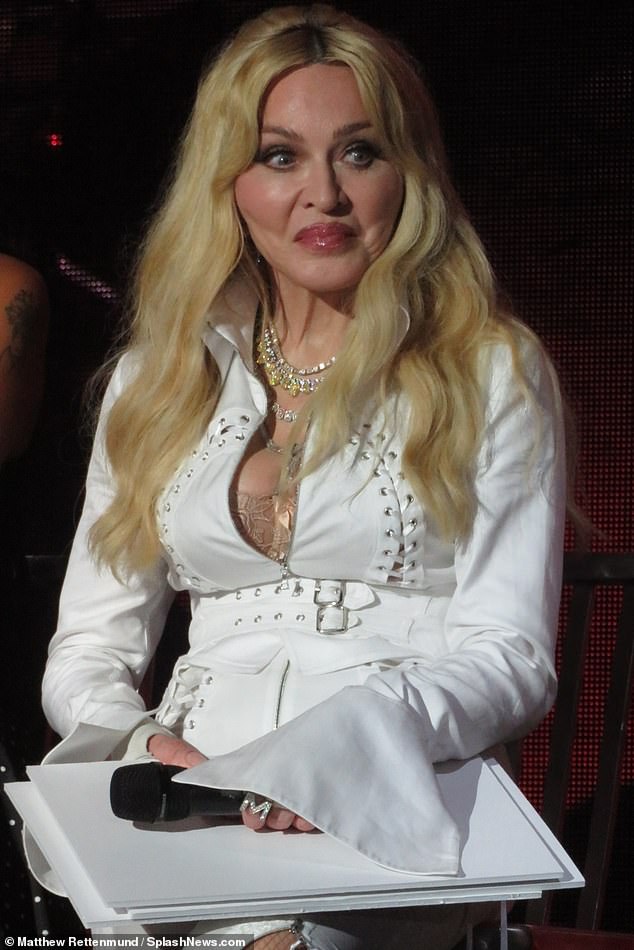 The queen of pop,65,who helped catapult the dance form into the mainstream with her 1990 hit Vogue,put on a very busty display in tiny white mini dress.