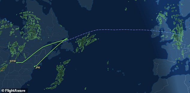 A spokesperson told DailyMail.com: 'Delta flight 136 from Detroit to Amsterdam diverted to New York's JFK early Wednesday morning after it was discovered that a portion of the in-flight meal service was spoiled.