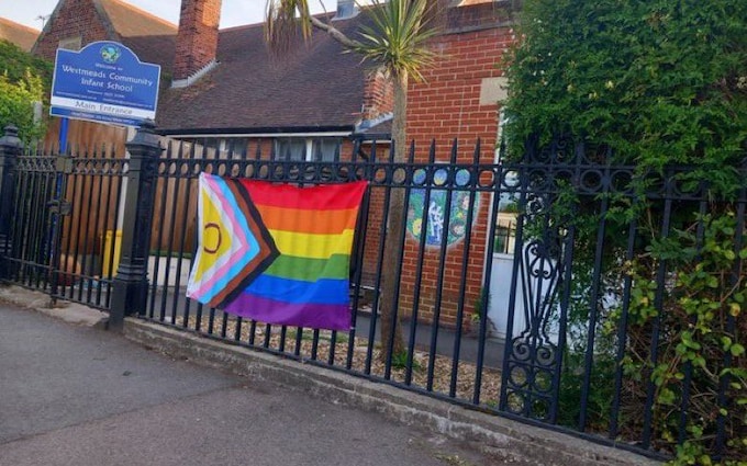 An infants school has been accused of “indoctrinating” four-year-old children after putting up Pride flags.