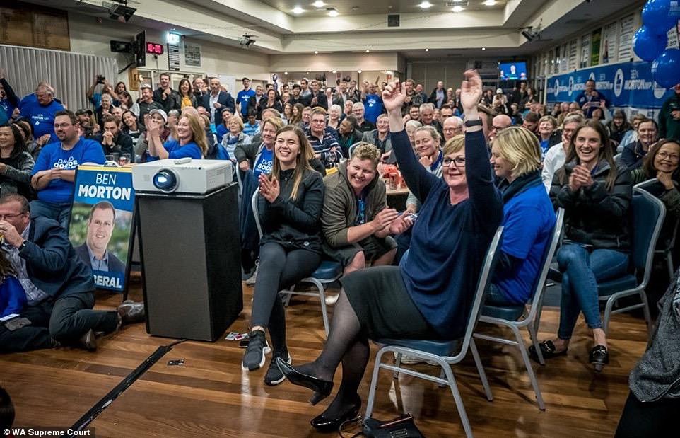 Brittany Higgins (pictured in black) was in Perth with her former boss Linda Reynolds (pictured with her arms in the air) when the Coalition won the federal election in 2019