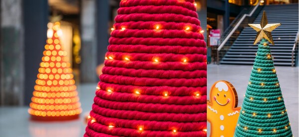 3-meter giant Gingerbread Man Yarn-weaving Christmas Tales Upcycled Yarn Christmas Trees embody The Mills\' spirit of sustainability