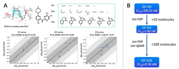 Figure A: Optimization and FEP prediction for R1,R2,and R3,with dark gray areas indicating a 1 kcal error range and light gray areas representing a 2 kcal error range; B: Overall molecular optimization process based on the DP101 scaffold